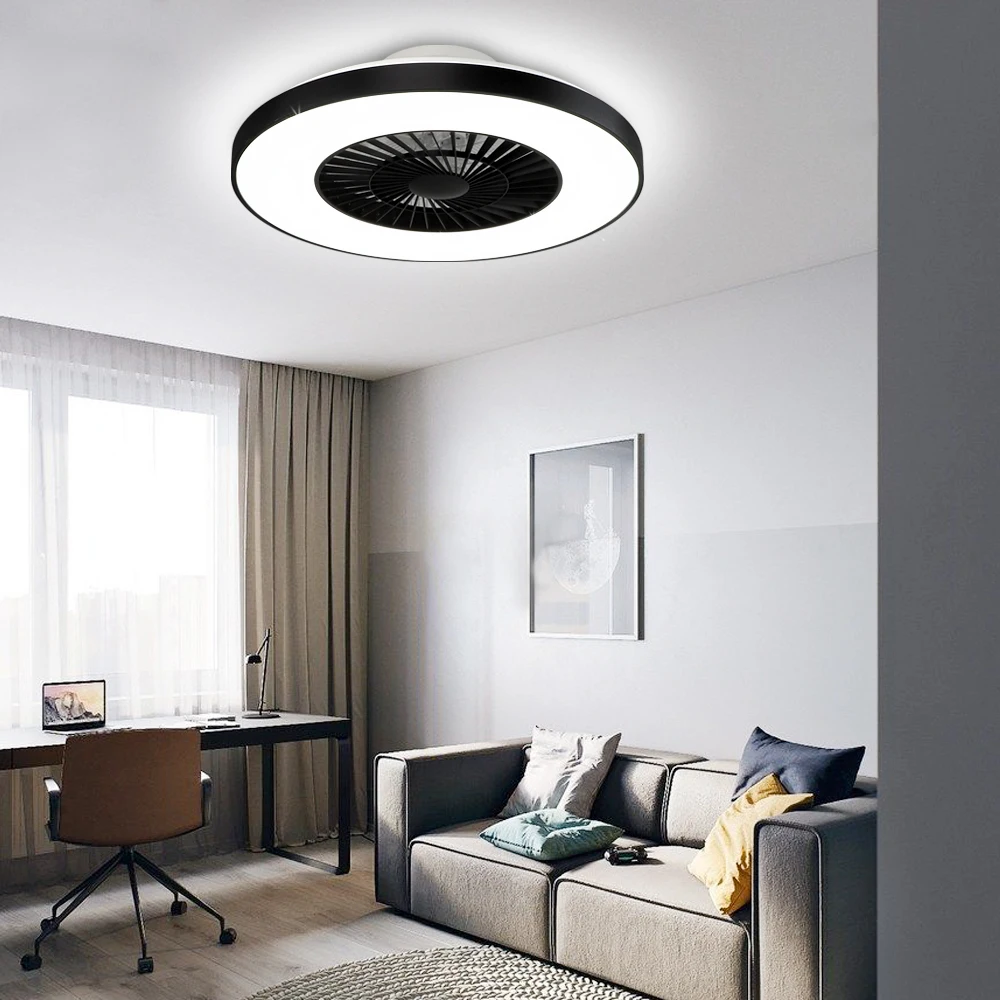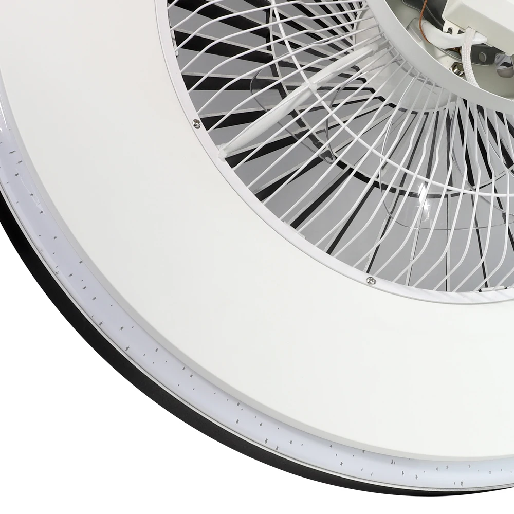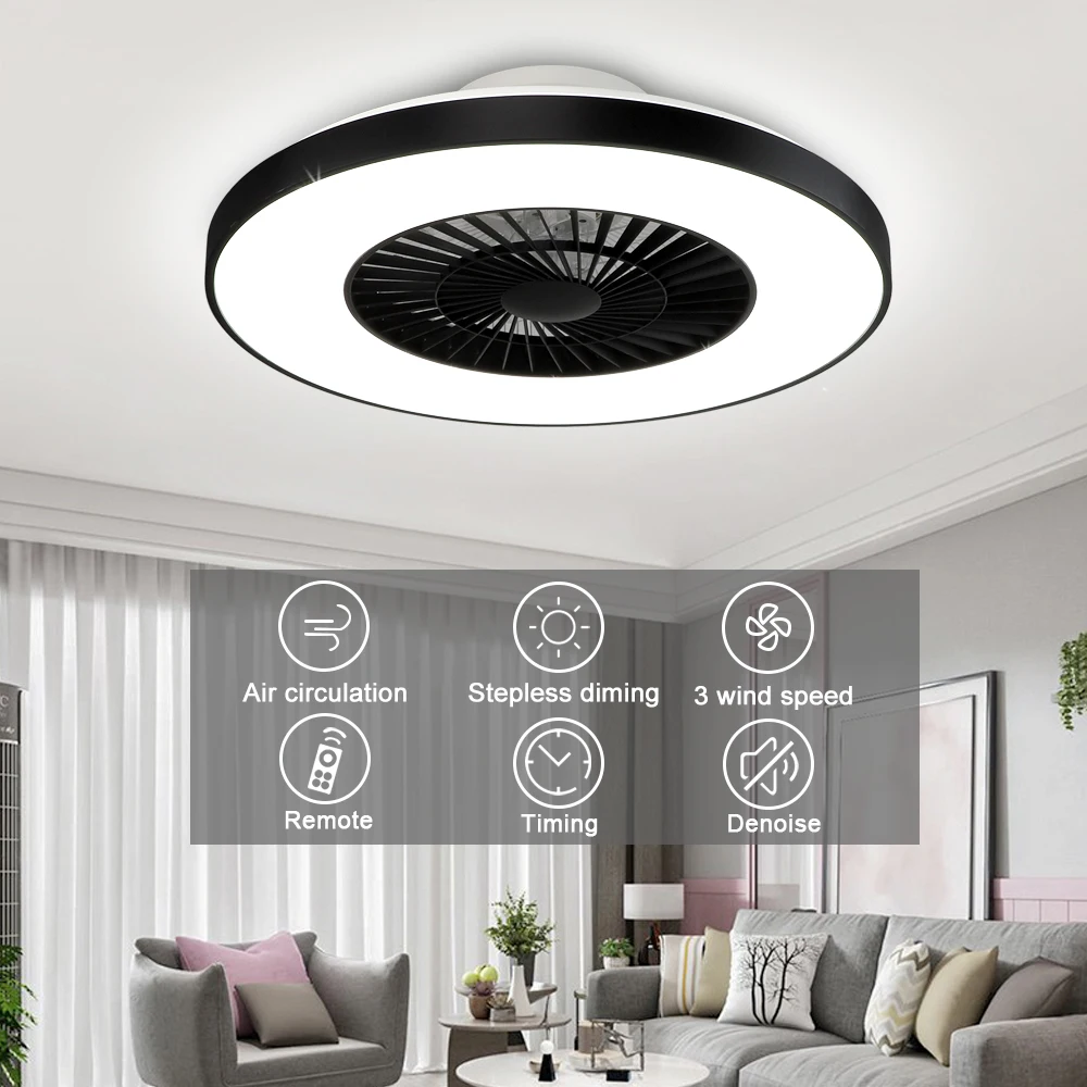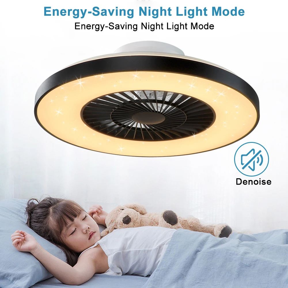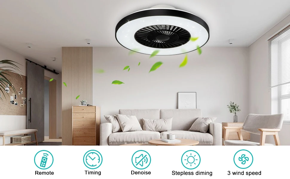 This is a modern style ceiling fan light. Its white lampshade and black plastic shell match simple and high-end. It has three different light colors that can be adjusted freely, and three wind speeds can be freely changed. In addition, this fan also has a timing service to make your life more intelligent. The ceiling fan has a built-in safe and durable high-quality 2835 LED chip, which protects the eyes and is healthier. And we also provide a complete 12-month quality assurance. So it is a perfect decoration for kitchen, bedroom, living room, etc.