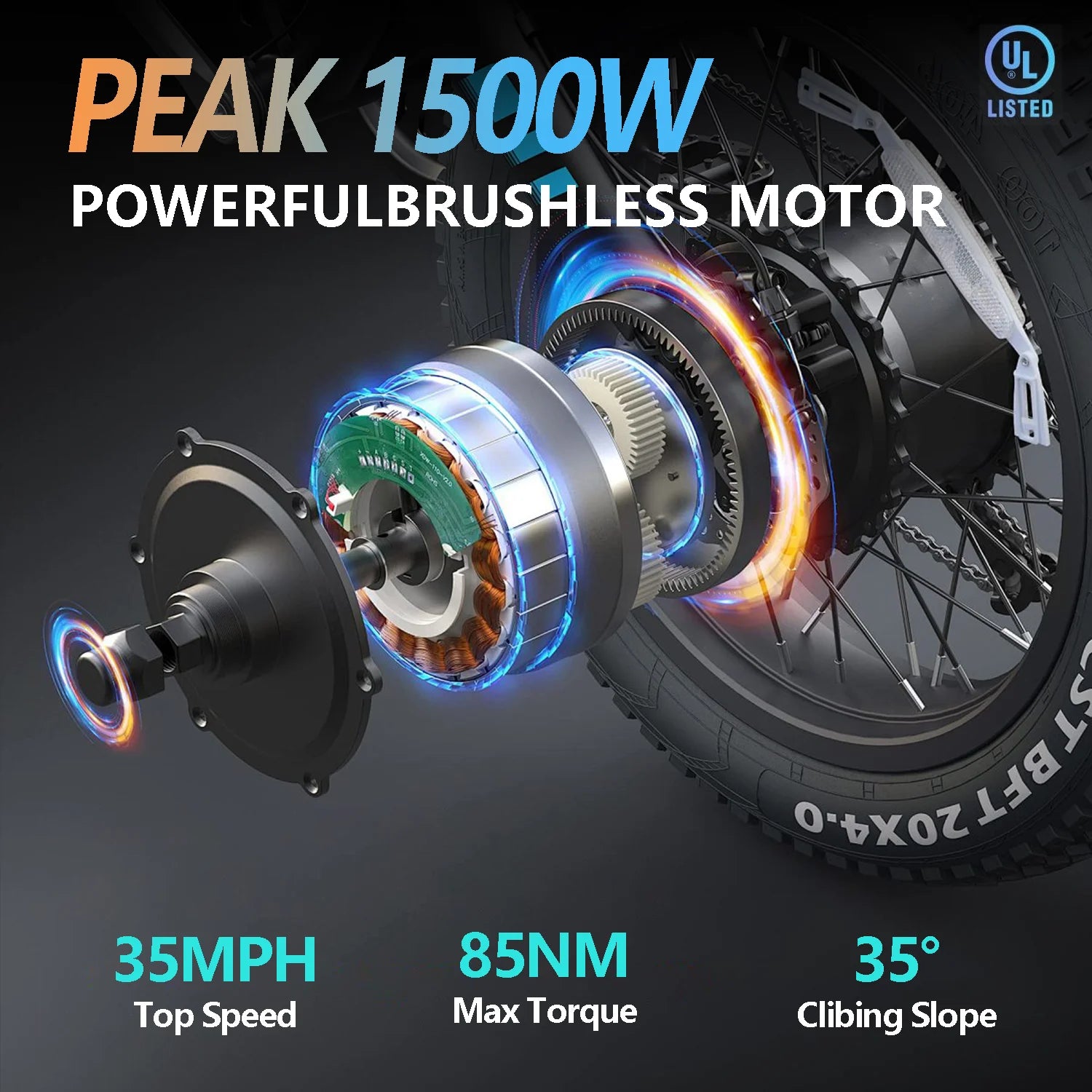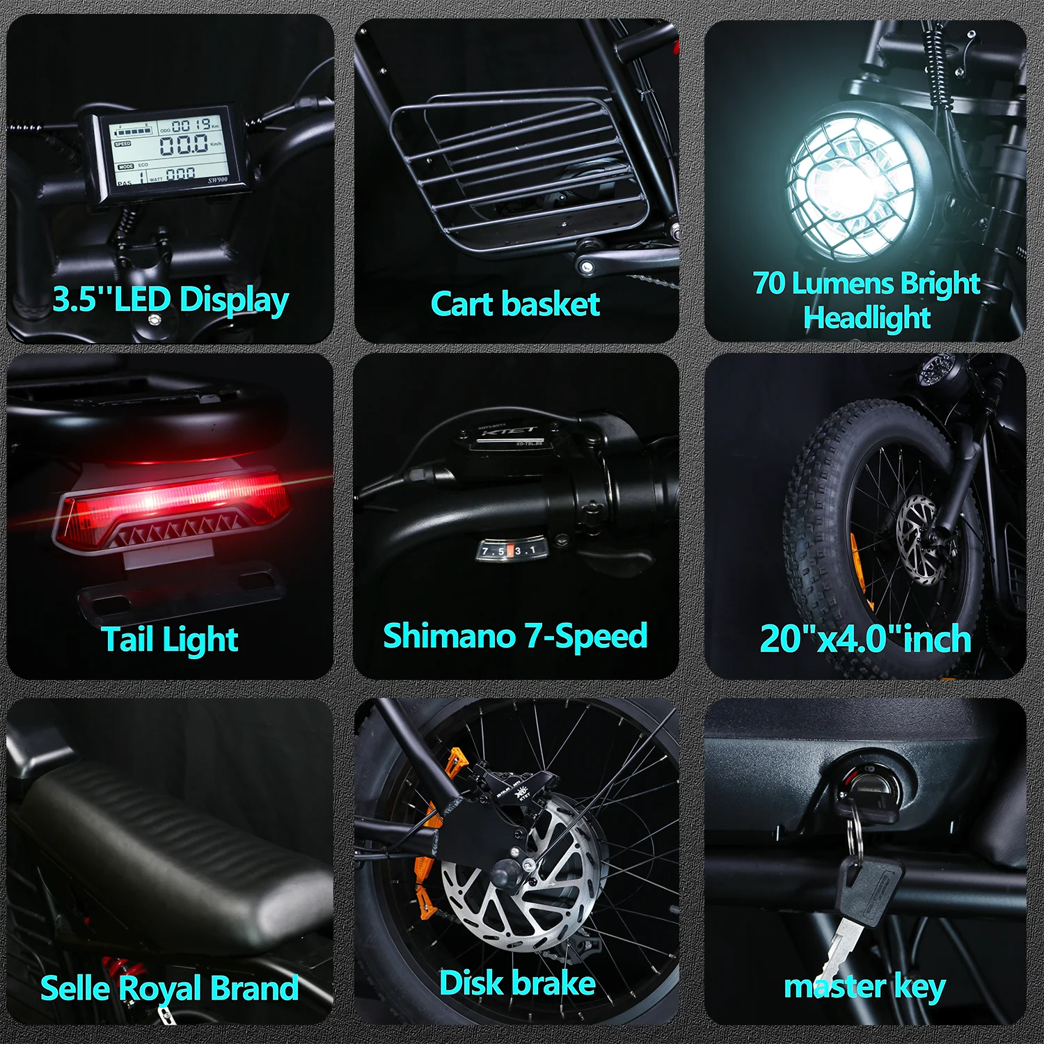 Engineered with carbon steel for superior durability, the frame is robust yet lightweight, ensuring a smooth and stable ride. The impressive 20-inch fat tires provide enhanced traction and stability, making it perfect for various terrains, whether you're navigating city streets or off-road trails.